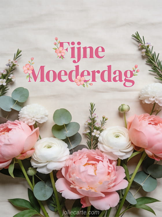 Deel je warmste moederdagwensen met dit elegante fotorealistische flat lay van roze pioenrozen, witte ranonkels en eucalyptus. Ontdek ook fijne moederdag kaarten of een gratis fijne moederdag kaart.