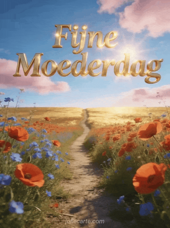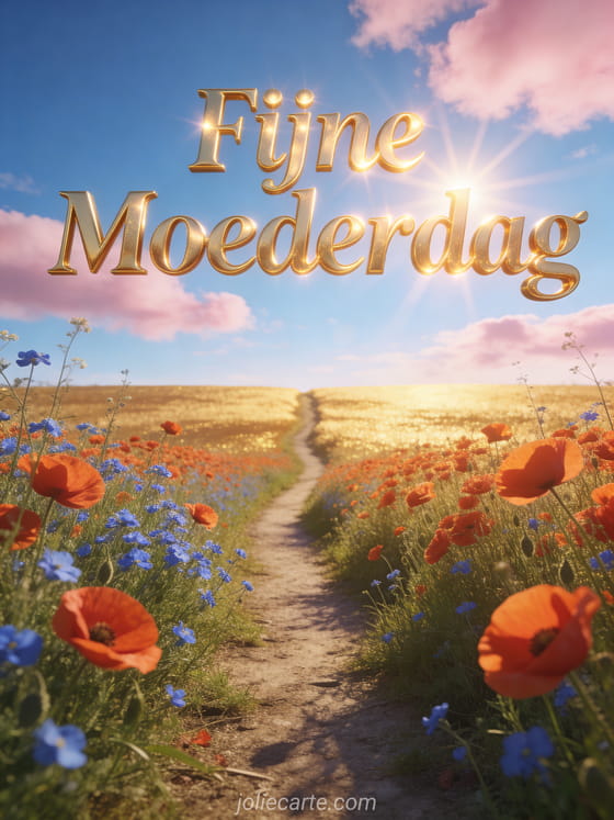 Deel deze lichtende moederdagkaart. Een landweg omzoomd met klaprozen en korenbloemen die leidt naar een gouden horizon onder een blauwe hemel met roze wolken. Ontdek ook een fijne moederdag mama kaart of een moederdag bedankt afbeelding.