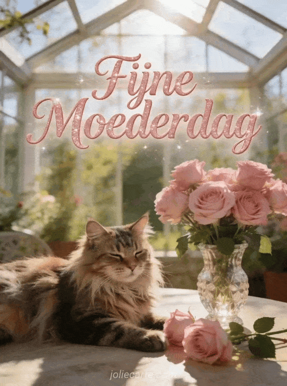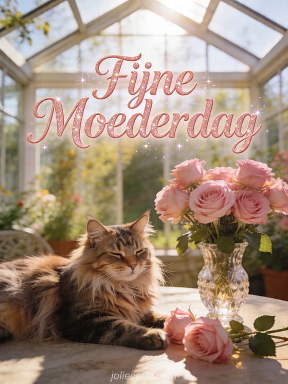 Deel een lichtgevende Moederdagkaart met roze schrift, een Maine Coon kat die rust in een zonnige serre, bloeiende roze rozen en een kristallen vaas. Ontdek ook goedemorgen en fijne Moederdag, versjes voor Moederdag of een Moederdagvers.