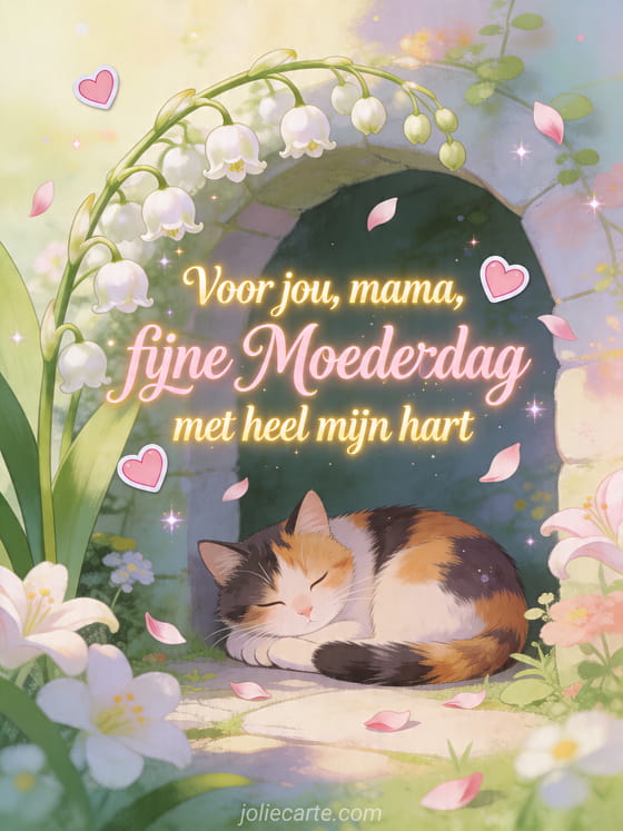 Deel een charmante Moederdagkaart met roze kalligrafie, hartjes, lelieblaadjes, een lapjeskat en lelietje-van-dalen in een vrolijk lentehoekje. Ontdek ook een fijne Moederdag bericht, kaartjes voor Moederdag of fijne Moederdag voor een aanstaande mama.