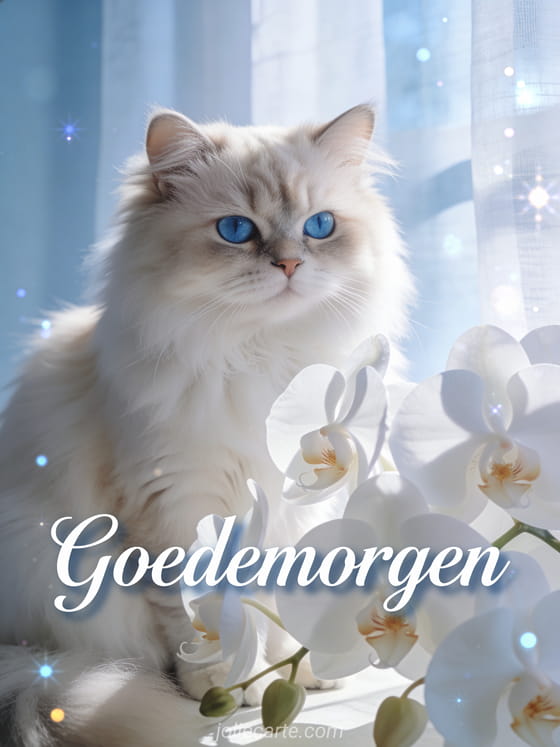 Stuur een elegante goedemorgengroet met een pluizige Perzische kat met blauwe ogen tussen witte orchideeën in een serene ochtendsfeer. Bekijk ook een ontroerend goedemorgen bericht.