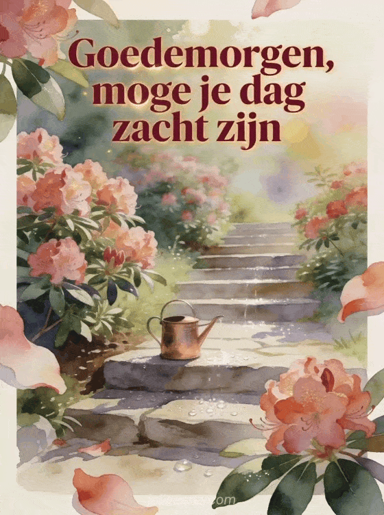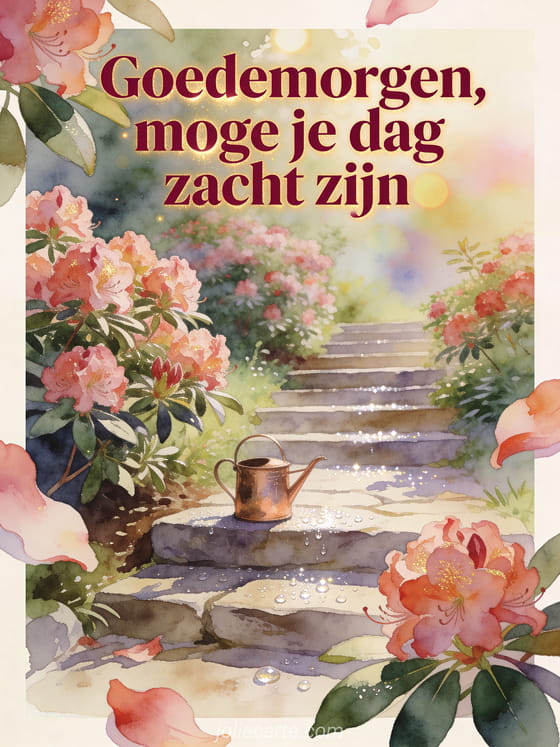 Stuur een vredig mooi goedemorgen bericht met warme bordeauxrode aquarelletters, een tuintrap langs rododendrons, een kleine koperen gieter en fonkelende dauw op steen. Ontdek ook schattig goedemorgen bericht met tederheid in de ochtend, goedemorgen bericht voor haar of goedemorgen bericht voor een vriendin.