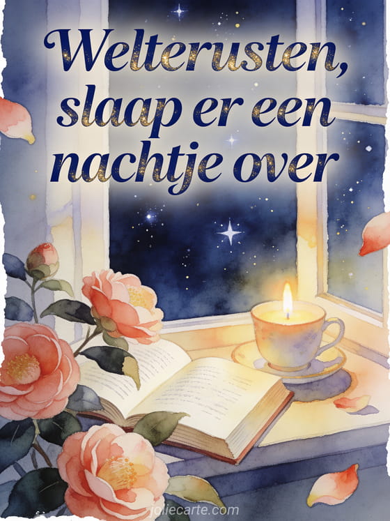 Stuur een mooi welterusten bericht met elegante nachtblauwe letters, warm kaarslicht en een rustige leesscène. Deze gratis kaart brengt een bedachtzame wens voor de nacht met een open boek, een kopje, camelia en sterren bij het raam. Bekijk ook een welterusten bericht voor hem kaart, een bericht om fijne nacht te wensen kaart of een welterusten bericht kaart.
