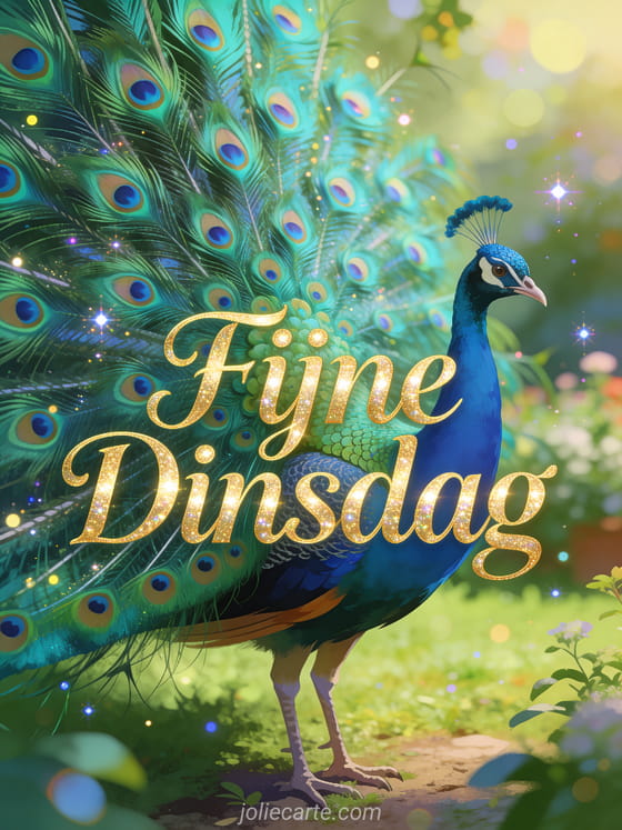Stuur een prachtige fijne dinsdag afbeelding via deze gratis wenskaart. Een majestueuze pauw met zijn iriserende veren volledig uitgespreid, schitterend turquoise blauw en groen verenkleed, een koninklijk elegante vogel portret in een tuinomgeving. Bekijk ook een picmix fijne dinsdag of een gif fijne dinsdag vrouw.