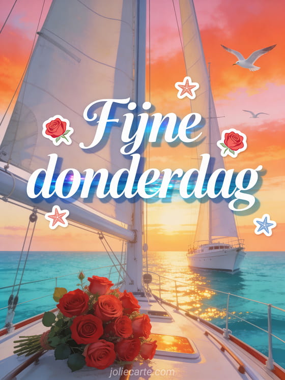 Wens fijne donderdag met zuiver witte letters, oceaanblauwe reflecties, rode rozen, zeesterren, een witte zeilboot op rustig turquoise water, meeuwen en een gloeiende zonsondergang. Bekijk ook fijne dag op donderdag, fijne donderdag kusjes afbeelding of goedemorgen het is donderdag afbeelding.