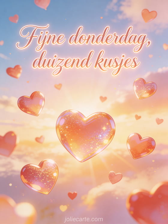 Deel duizend kusjes voor fijne donderdag met delicate cursieve letters, glanzende gloed, veel zwevende harten in een stralende ochtendhemel, zachte glitter en een warm liefdevol palet. Bekijk ook fijne donderdag hond afbeelding, fijne donderdag kat gif of fijne donderdag virtuele kaart.