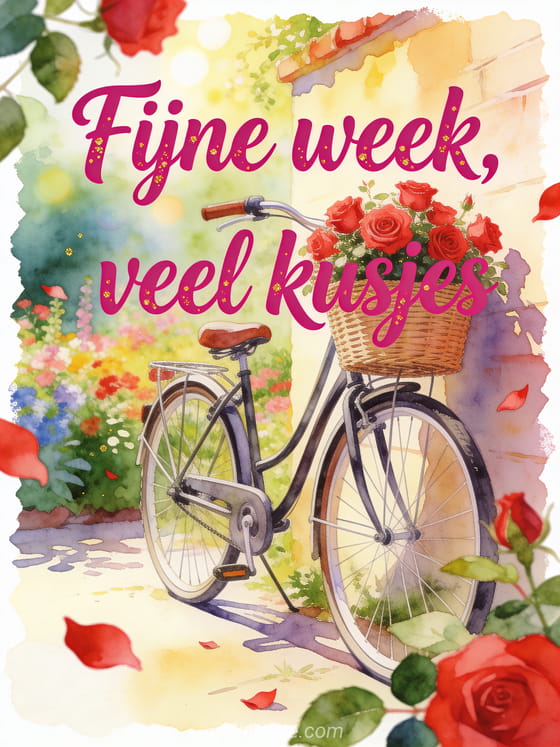Deel een heldere wens voor een fijne week met levendige fuchsia letters, een charmante fiets, een mand vol rode rozen en een zonnige tuinmuur. Ontdek ook fijne week allemaal kusjes afbeeldingen, fijne week kusjes geanimeerde gifs of afbeeldingen fijne week.