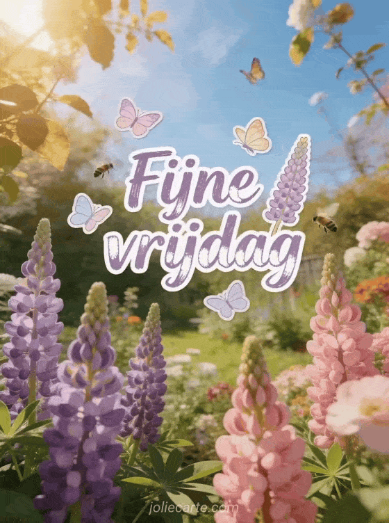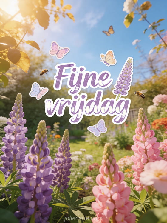 Wens een fijne vrijdag met een kleurrijke landelijke tuin, bloeiende lupines, pastelkleurige vlinders, bijen en gouden licht. Bekijk ook een fijne vrijdag humor gif, een goedemorgen fijne dag op vrijdag kusjes of een hele fijne vrijdag.