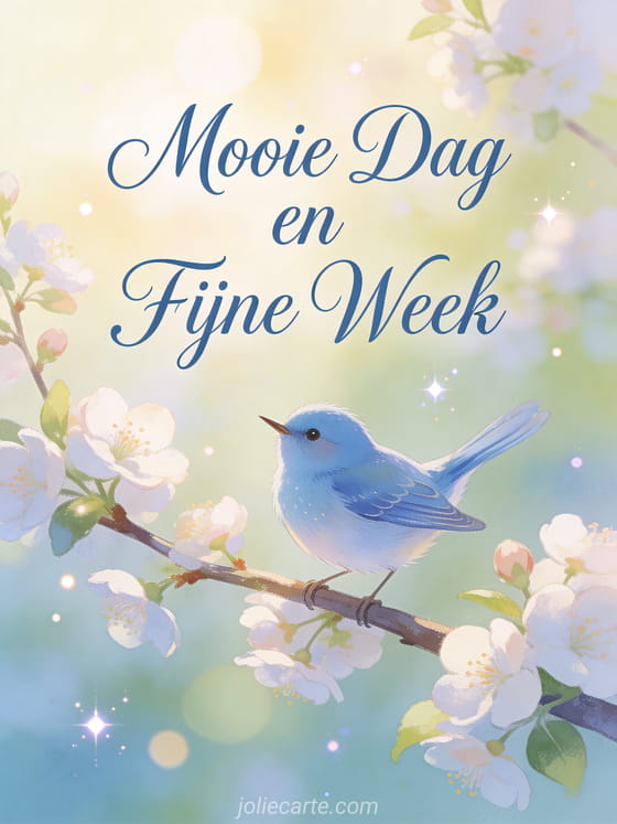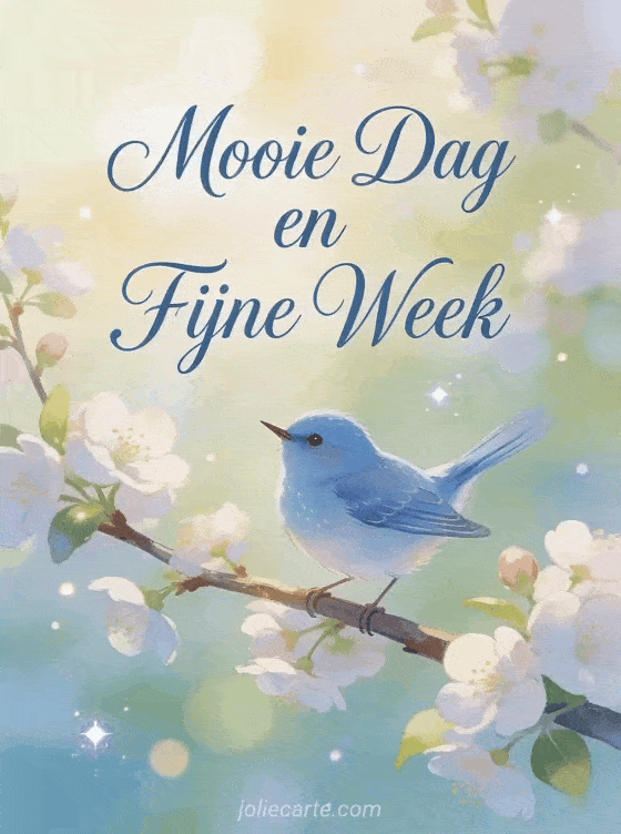 Stuur een wens voor een mooie dag en fijne week en breng een glimlach op iemands ochtend. Een delicaat blauw vogeltje zingt op een tak met lenteblœsem schept een frisse en vrolijke sfeer. Ontdek ook een kaart fijne week fijne dag of een gif fijne week humor.