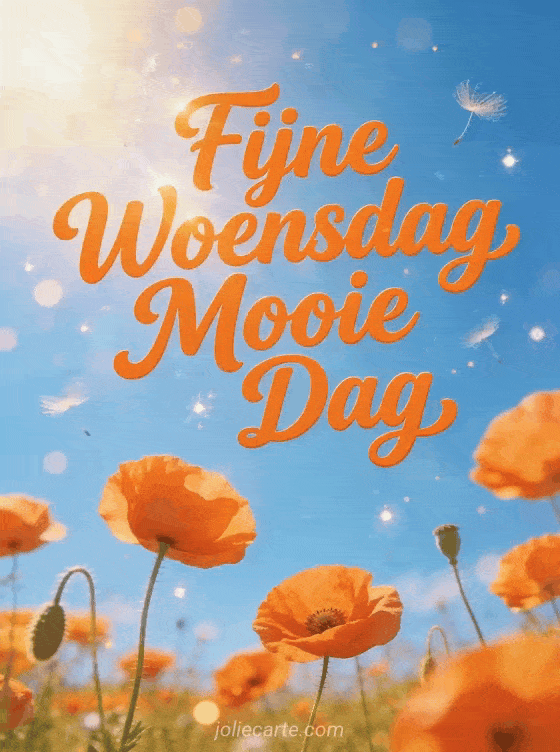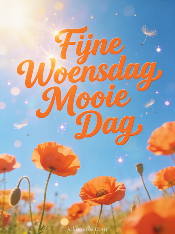 Stuur een vrolijke mooie dag fijne woensdag groet via deze gratis wenskaart. Een veld van heldere oranje klaprozen onder een stralende blauwe zomerhemel, schitterend zomers daglicht met warm goudkleurig zonlicht overal, een vrolijke optimistische sfeer met zwevende zaadjes. Bekijk ook een kusjes smiley fijne woensdag of een fijne woensdag met katten.