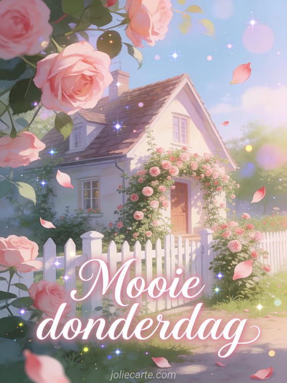Deel een dromerige donderdaggroet met een charmant huisje omringd door klimrozen en een witte houten omheining. Ontdek ook een fijne donderdag zen of een heel fijne donderdag kaart.
