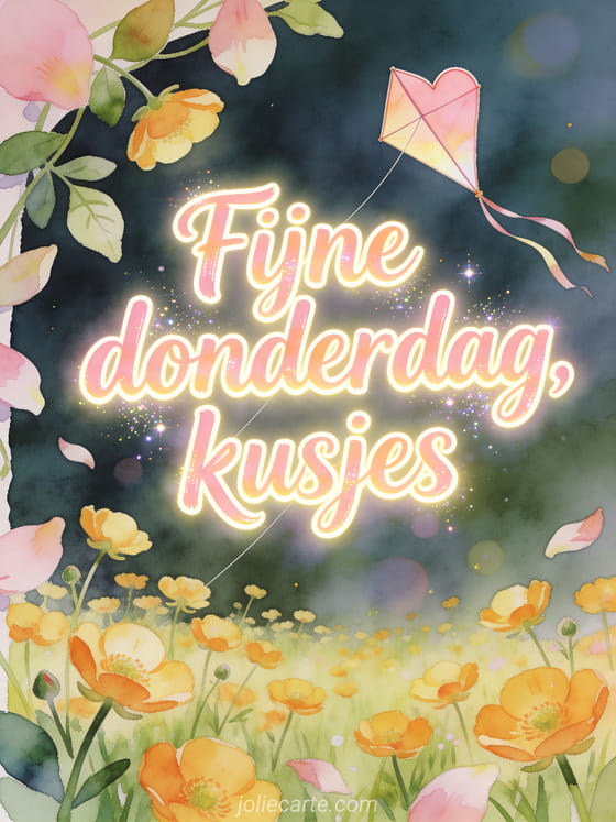 Deel fijne donderdag, kusjes met perzikroze letters, een hartvormige vlieger boven een zonnige boterbloemenweide en bloemblaadjes over de rand. Ontdek ook fijne dag donderdag afbeelding, fijne donderdag met citaat of fijne donderdag kat gif.