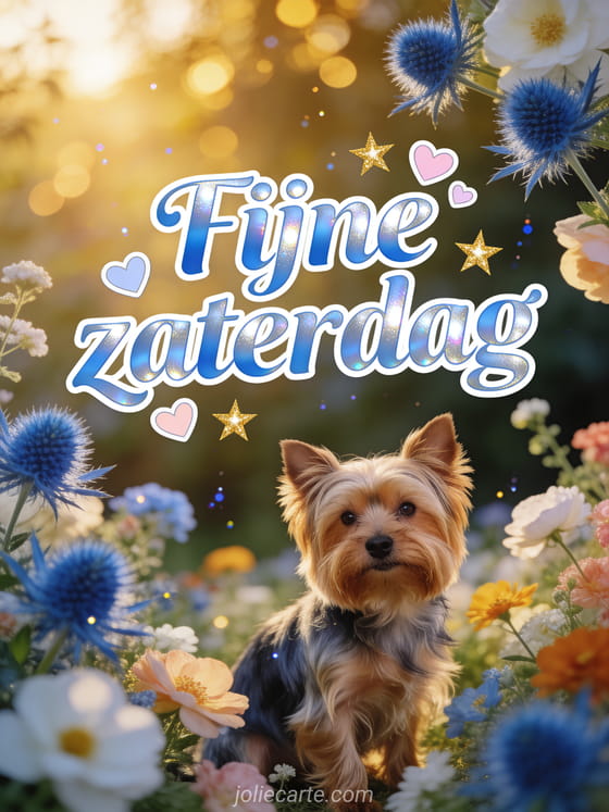 Verstuur een mooie fijne zaterdag afbeelding met blauwe distels, pastelhartjes en warm gouden licht. Deel een zachte weekendwens en ontdek ook fijne zaterdag fijn weekend kusjes, fijne zaterdag geanimeerde afbeelding of fijne zaterdag vrouw gif.