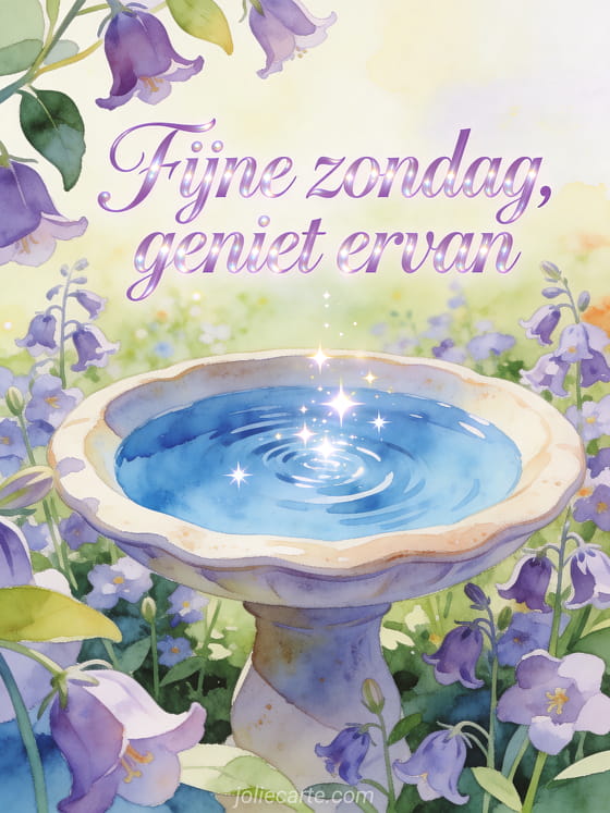 Wens fijne zondag met een keramisch vogelbad dat zonlicht weerspiegelt, blauwe waterrimpels en klokjesbloemen in een mooie aquareltuin. Deel deze vredige kaart en ontdek ook fijne zondag wensen afbeelding, glinsterende fijne zondag gifs of fijne zondag geanimeerde kaarten.