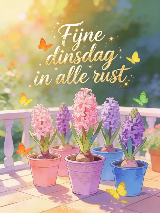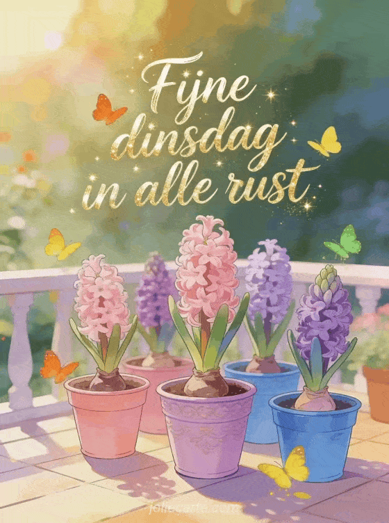 Deel mooie geanimeerde fijne dinsdag afbeeldingen met vloeiende penseelletters, potten met hyacinten op een zonnig terras en kleurrijke vlinders in het licht. Stuur ook een fijne dinsdag regen afbeelding, fijne dinsdag Facebook afbeeldingen of een fijne dinsdag in de regen afbeelding.
