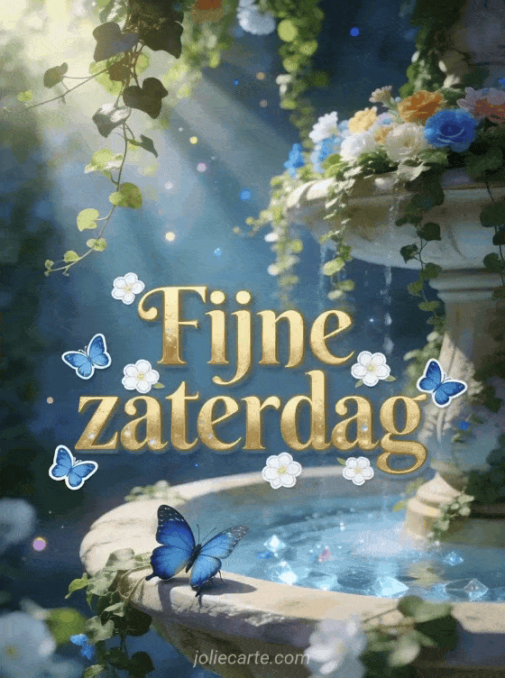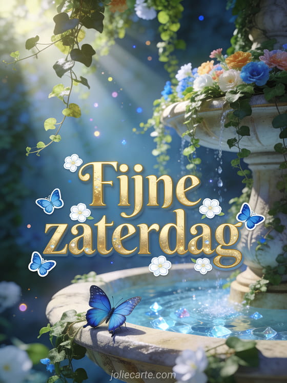 Stuur een betoverende zaterdaggroet met elegante oude gouden letters, witte bloemen, blauwe vlinders en een oude fontein bedekt met klimop, kristalhelder water en een blauwe morpho vlinder. Bekijk ook deze goedemorgen fijne zaterdag fijne dag, deze fijne zaterdag en fijn weekend kusjes of deze fijne zaterdag fijn weekend afbeelding.