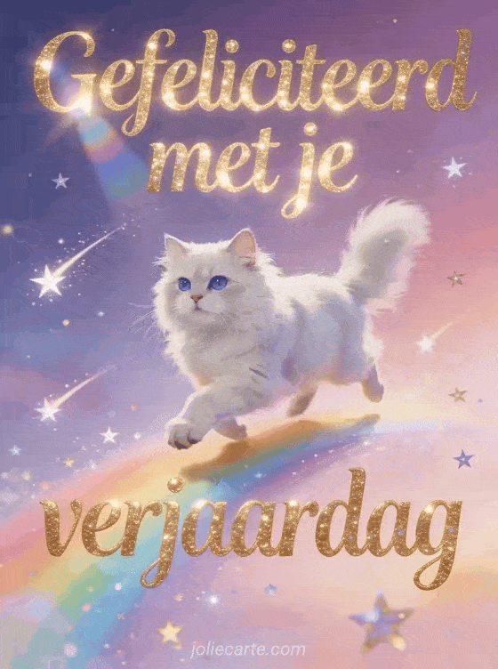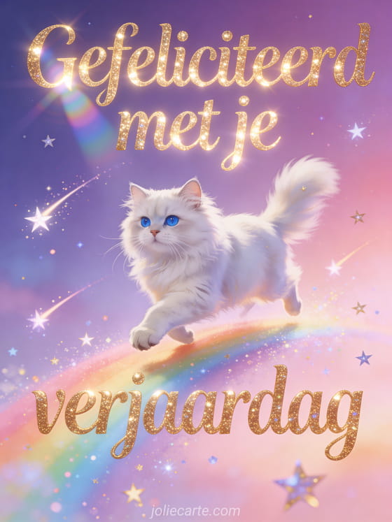 Deel een betoverde verjaardagsgroet met gouden letters, een blauwogige witte Perzische kat die op een regenboog galoppeert, vallende sterren, magische glitter en een lichtgevende violet-roze achtergrond. Ontdek ook een humoristische verjaardagstekst kind, een muzikale verjaardagskaart kind of een verjaardagskaart kind knutselen.