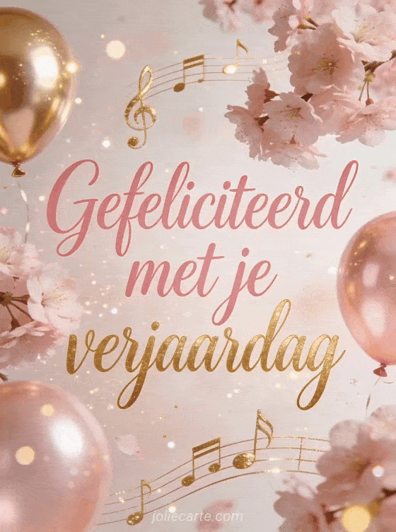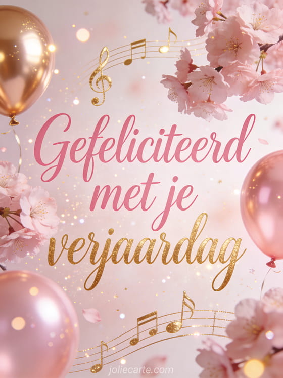 Verras haar met een melodieuze verjaardagskaart. Gouden muzieknoten drijven tussen roze kersenbloesem en rose gold ballonnen met glinsterende deeltjes in pastelroze en gouden tinten — elegant en vrolijk. Ontdek ook een gratis geanimeerde verjaardagskaart vrouw of een ontroerend tekst verjaardag vrouw.