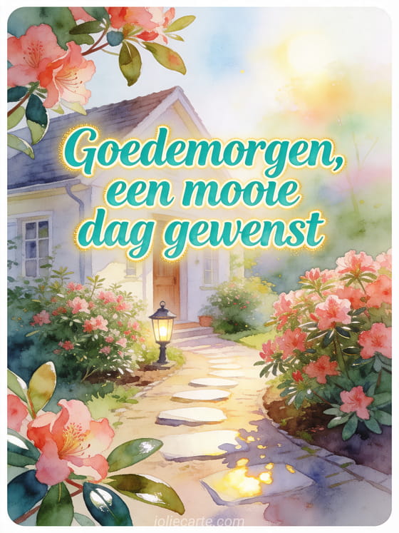 Stuur een mooie goedemorgen boodschap met een uitnodigende kaart langs een cottagepad tussen azalea's en fris ochtendlicht. Deel ook een goedemorgen dieren kaart, een een goedemorgen bericht of een sms goedemorgen vriendschappelijk.