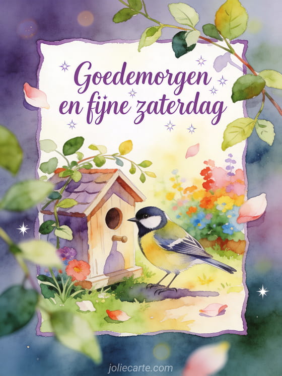 Deel een heldere zaterdagochtendboodschap met een koolmees bij een klein vogelhuisje in een kleurrijke tuinhoek. Stuur ook een fijne zaterdag koffie gif, een fijne zaterdag allemaal afbeelding of een goedemorgen het is zaterdag afbeelding.