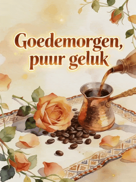 Deel een rijk ochtendmoment met deze aquarelkaart, met een koperen cezve, koffiearoma, een volle roos en verspreide bonen op stof met patroon. Bekijk ook goedemorgen goede koffie, goedemorgen koffie kusjes gif of goedemorgen koffie hart gif.
