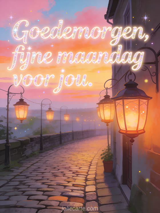 Stuur een mooie goedemorgen maandag-groet met hangende lantaarns naast een geplaveid straatje bij zonsopgang. Bekijk ook sprankelende fijne maandag gif sprankelend, fijne zonnige maandag afbeelding of goedemorgen fijne maandag kusjes afbeelding.