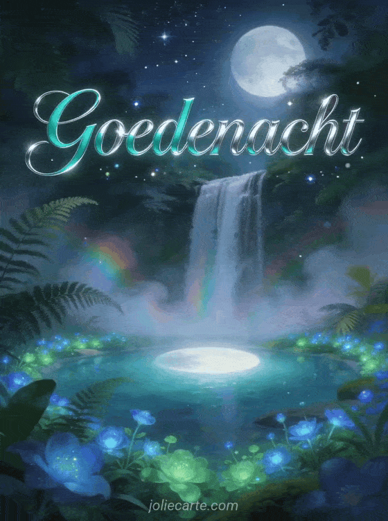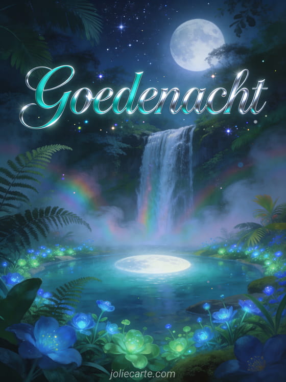 Stuur prachtige goedenacht berichten via deze gratis wenskaart. Een majestueuze waterval die neerstort in een maanverlicht bassin omgeven door varens en tropische bloemen, bioluminescente planten gloeien blauw en groen langs de waterrand. Bekijk ook een tederheid fijne avond en goedenacht of een goedenacht aan iedereen kusjes.