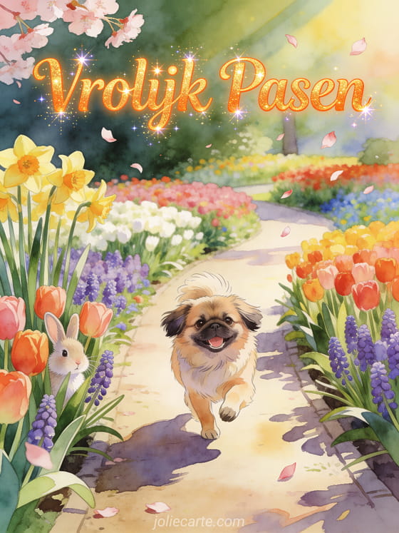 Stuur een stralende paaskaart met een pekinees die vrolijk loopt langs een met bloemen omzoomd Keukenhof pad, levendige tulpenbedden in elke kleur aan beide zijden, grote narcissen en druivenblauwe hyacinten langs de wandelweg en een klein pluizig Paaskonijn glurend achter de tulpen. Ontdek ook een mooie paaskaarten of een virtuele paaskaarten.
