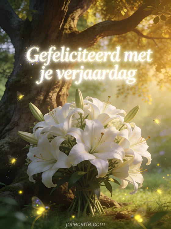 Verras een man met deze betoverende verjaardagskaart met een boeket witte lelies onder een eeuwenoude boom met vuurvliegjes. Ontdek ook een verjaardagskaart man tuinier of een verjaardagsbericht voor je man.