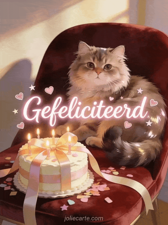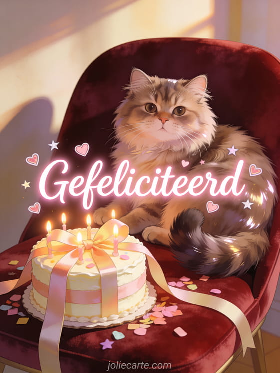 Deel een warme verjaardagswens met lichtgevende roze kalligrafie, kleine hartjes en sterren, een realistische Perzische kat die naast een taart met lint rust, gloeiende kaarsen, verspreide confetti en zacht middaglicht. Je kunt ook een gratis gefeliciteerd kaart vrouw, een verjaardagskaart vrouw gif of een gratis en geanimeerde verjaardagskaart vrouw sturen.