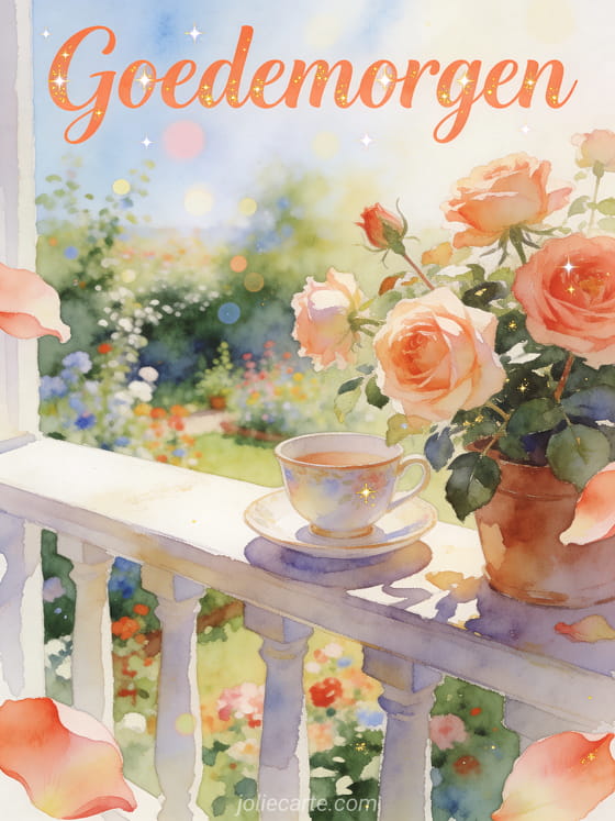 Stuur een mooie gratis virtuele goedemorgen kaart met elegante koraalkleurige aquarelletters, een porseleinen kopje, bloeiende oude tuinrozen en een heldere balkonrand. Ontdek ook gratis virtuele goedemorgen kaarten, goedemorgen en beste wensen of klein bericht voor goedemorgen.