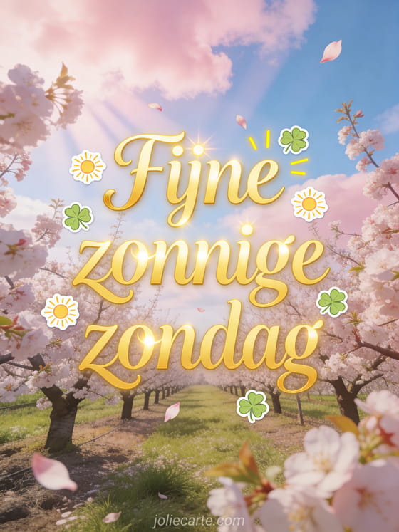 Stuur een vrolijke groet voor fijne zonnige zondag met elegante gouden letters, stickers van stralende zonnetjes, zwevende klavertjes vier en een bloeiende pruimenboomgaard onder een pastelkleurige roze en blauwe hemel. Bekijk ook deze fijne regenachtige zondag, deze fijne zondag geanimeerde gifs of deze goedemorgen zondag kaart.