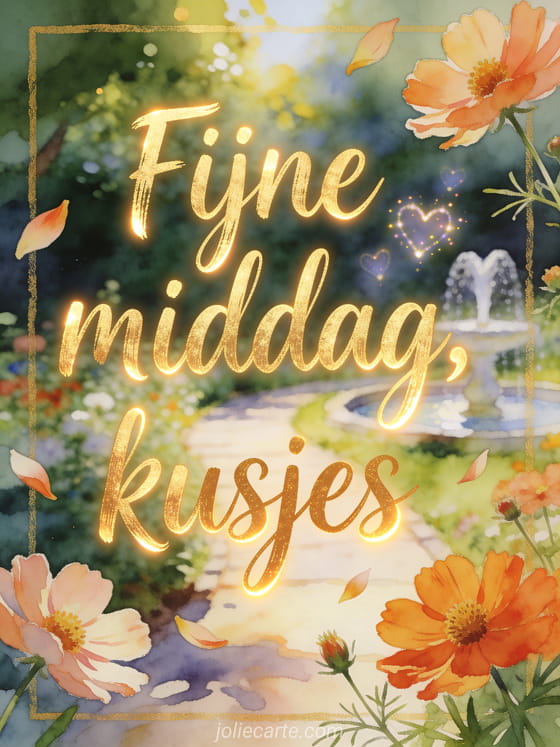 Deel een heldere middagkaart met gouden letters, kosmosblaadjes over de rand, een zonnig tuinpad, een kleine fontein en hartvormige lichtjes. Verstuur ook vriendschap fijn einde van de middag kusjes, fijne middag kusjes voor jou of humor goedemiddag.