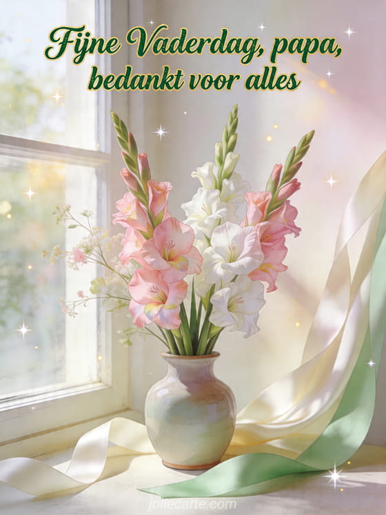 Stuur een mooie Vaderdagkaart met verfijnde bosgroene kalligrafie, gouden rand en een delicate botanische illustratie van hoge gladiolen in een keramische vaas bij een zonnig raam met satijnen linten. Ontdek ook fijne vaderdag voor alle papa's, vaderdag ik mis je of een fijne vaderdagkaart.