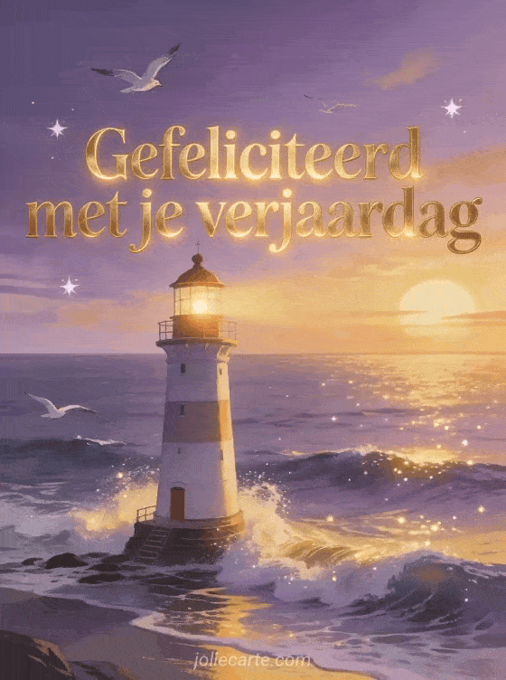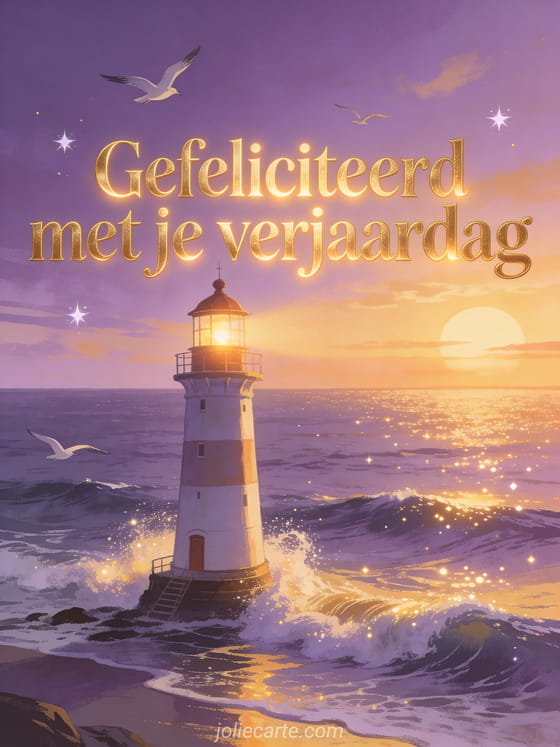 Verras een man met deze prachtige verjaardagskaart met een vuurtoren aan de oceaan bij zonsondergang. Ontdek ook een verjaardagskaart man sportwagen of een gratis verjaardagskaart man dromadaris.