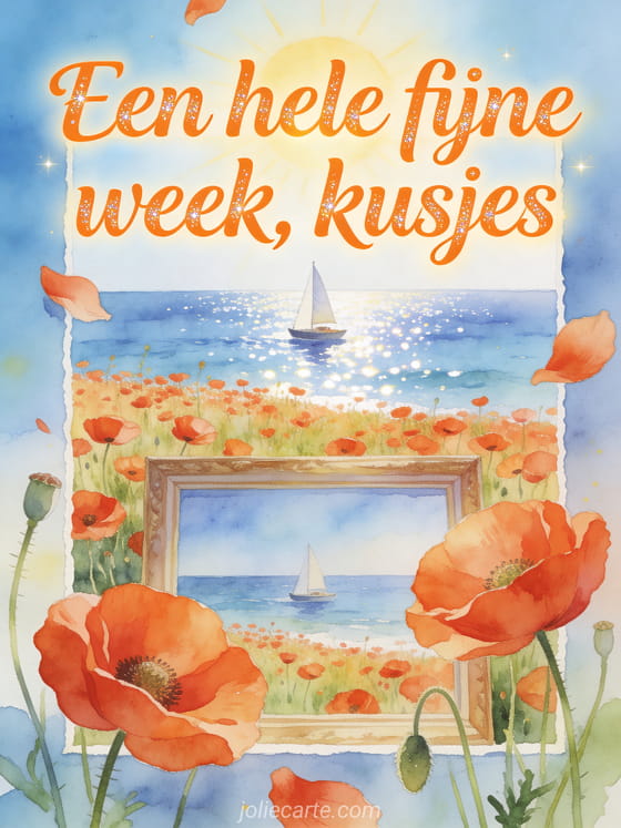 Wens een hele fijne week met zonnige oranje letters, klaprozen aan de kust en een kleine zeilboot op sprankelend blauw water. Ontdek ook een kaart fijne week dikke kusjes afbeelding, een kaart afbeelding hallo en fijne week of een kaart goedemorgen allemaal en fijne week.