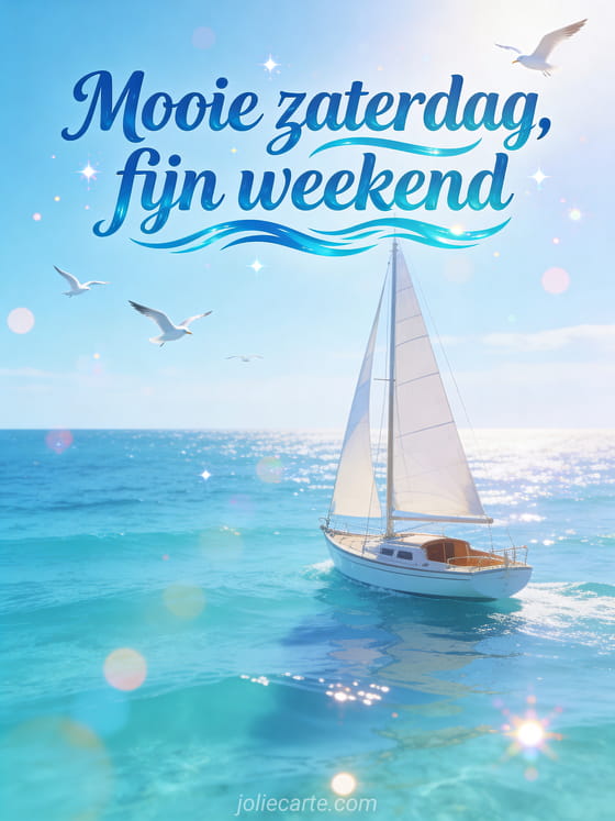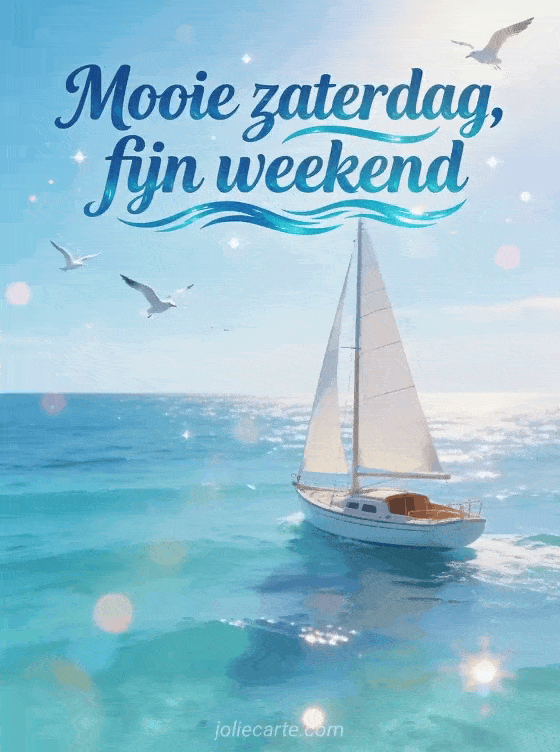 Deel een heldere groet voor zaterdag en het weekend met een rustige zeilboot, turquoise zee, vliegende meeuwen en een gevoel van vrijheid op het water. Je kunt ook fijne zaterdag mooie afbeeldingen of mooie geanimeerde fijne zaterdag afbeelding sturen.
