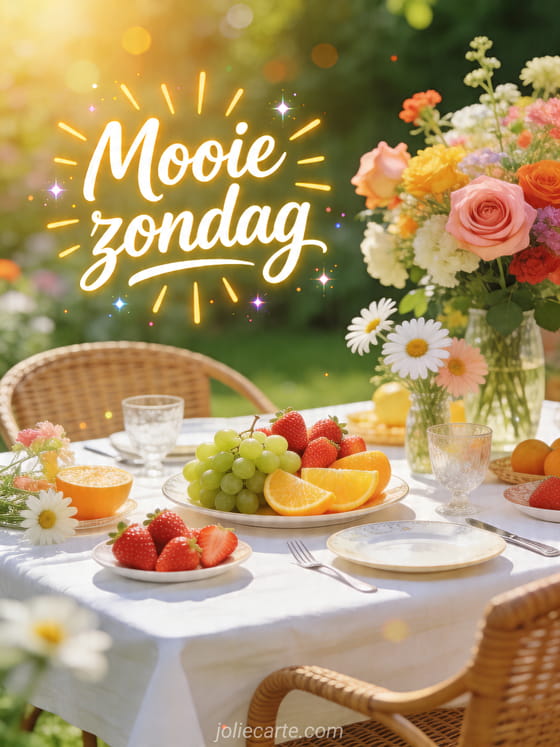 Deel een mooie zondag met deze frisse brunchkaart voor buiten vol bloemen en licht. Ontdek ook bericht van fijne zondag, goedemorgen fijne zondag geanimeerde gif of fijne zondag regen.
