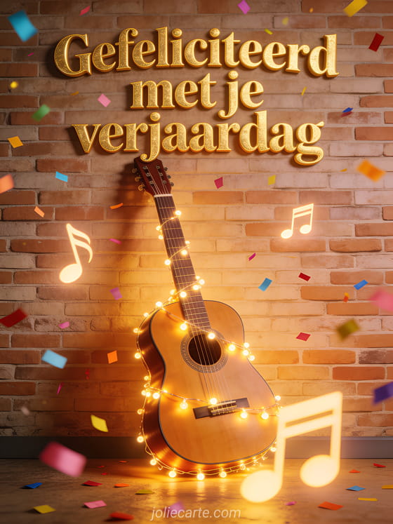 Stuur een feestelijke muzikale verjaardagsgroet met een akoestische gitaar versierd met lichtjes en kleurrijke confetti. Muzieknoten zweven in de lucht! Bekijk ook muzikaal verjaardagskaart geanimeerd gratis sprekend of verjaardagskaart geanimeerd gratis sprekend.