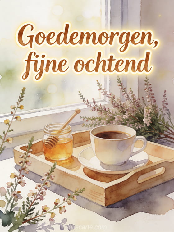 Begin de ochtend rustig met sepia aquareltekst, een ontbijtdienblad, een kopje koffie, een honingpot, takjes heide en luchtig raamlicht. Ontdek ook een kaart voor gratis goedemorgen koffie afbeelding, een kaart voor koffie goedemorgen koffie geanimeerde gif of een kaart voor goedemorgen koffie gif.