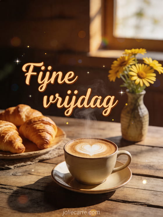 Begin vrijdag gezellig met deze uitnodigende kaart vol dampende cappuccino, gouden croissants en gele margrieten op een rustieke ontbijttafel. Ontdek ook goedemorgen fijne vrijdag fijne dag, fijne vrijdag kat of goedemorgen het is vrijdag gif.