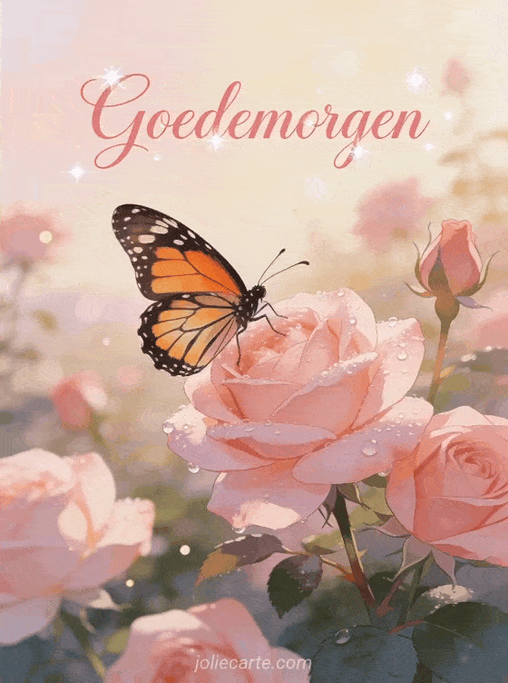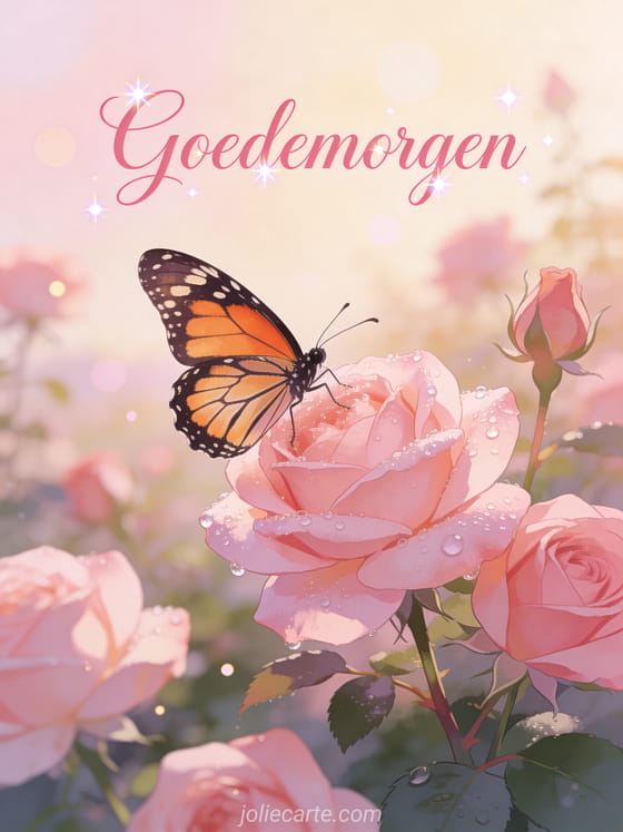 Stuur een ontroerende en romantische goedemorgengroet voor haar met een prachtige vlinder op dauwige rozen in een tuin bij dageraad. Bekijk ook een goedemorgen geanimeerde gif of een ochtend goedemorgen.