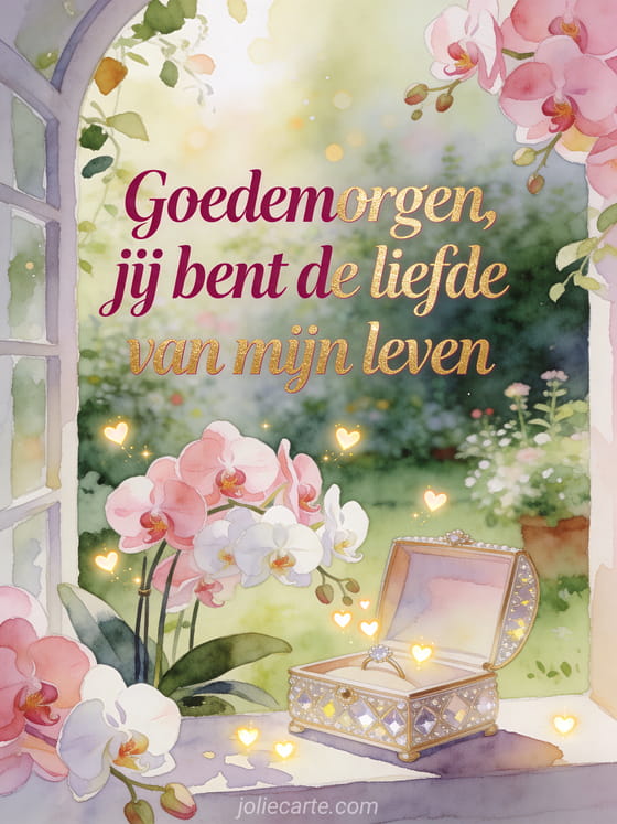 Stuur een ontroerend goedemorgen bericht voor mijn vrouw met een heldere aquarelscène van orchideeën, een juwelendoosje en kleine lichtgevende harten. Deel deze tedere groet om haar dag liefdevol te beginnen, en ontdek ook een goedemorgen bericht voor haar man, een lief goedemorgen bericht of een tederheid ochtend goedemorgen.