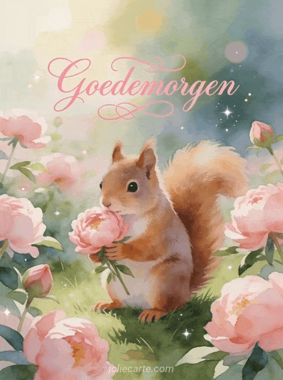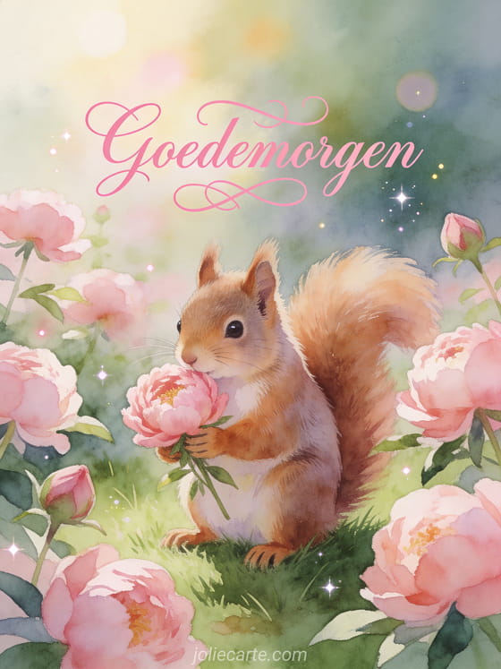 Stuur een romantisch en ontroerend goedemorgen bericht met een schattige eekhoorn die een roze pioenroos vasthoudt in een zachte ochtendtuin.