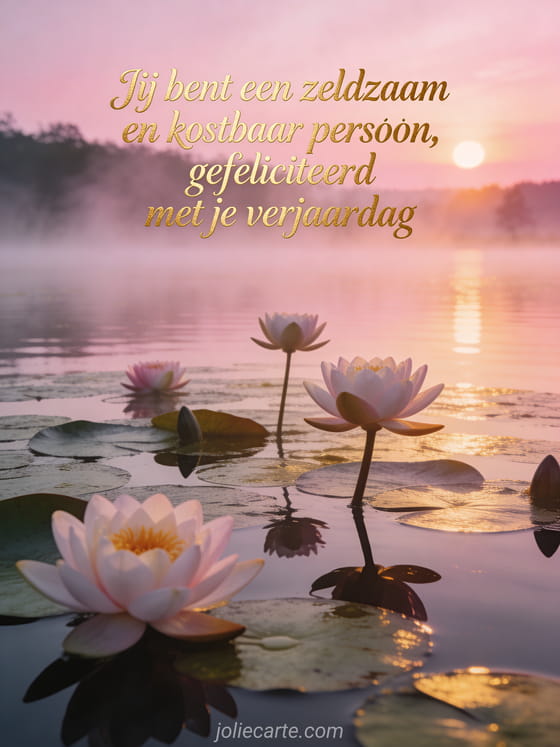 Raak haar hart met deze prachtige kaart op haar verjaardag. Een rozige zonsopgang boven een rustig meer met bloeiende waterlelies en ochtendmist in gloeiend gouden licht — sereen en ontroerend. Ontdek ook een champagne gefeliciteerd verjaardag vrouw of een gefeliciteerd boeket verjaardag vrouw.