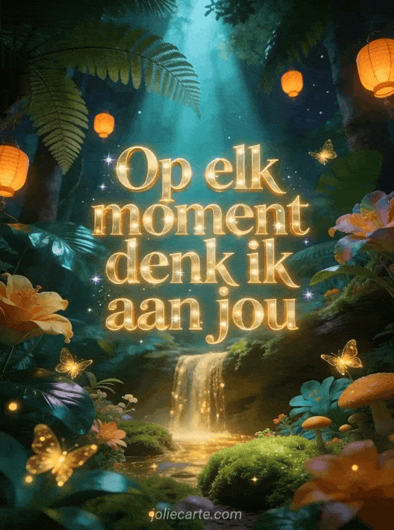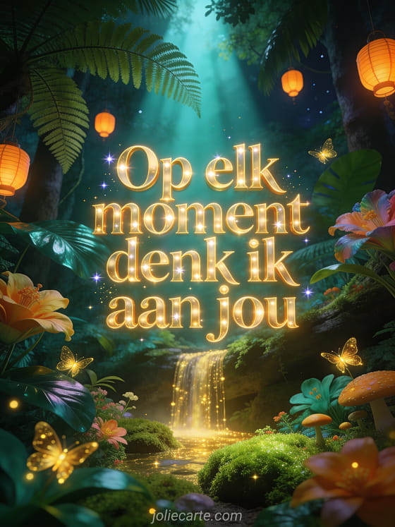 Stuur een betoverende kaart met een weelderig tropisch bos in een betoverde nacht met oranje lantaarns die tussen de bomen drijven en gouden vuurvliegjes om iemand te laten weten dat je op elk moment aan hem denkt. Bekijk ook een ik denk aan jou juweel, afbeelding vriendschap ik denk aan jou of fijne dag ik denk aan jou.