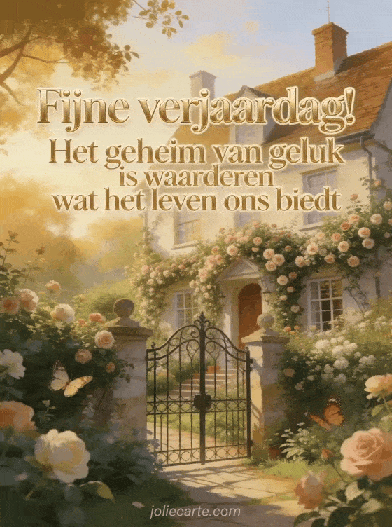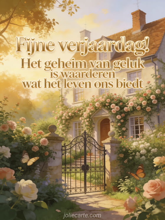 Verras met een originele verjaardagszin op deze elegante vintage kaart met een Engels cottage, klimrozen, vlinders en zachte middagzon. Ontdek ook gelukkige verjaardag originele kaart, een gelukkige verjaardag wensen en gelukkige verjaardag sympathiek.