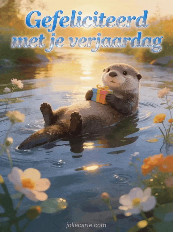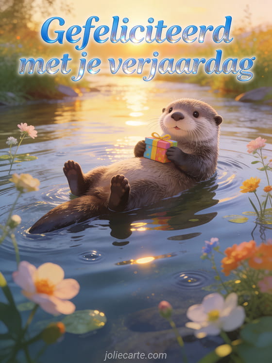 Stuur een schattige gratis verjaardagskaart met een otter die op zijn rug drijft en een cadeautje vasthoudt bij zonsondergang. Ontdek ook gelukkige verjaardag schattige hond, we wensen hem een gelukkige verjaardag of gelukkige verjaardag schattig gif.