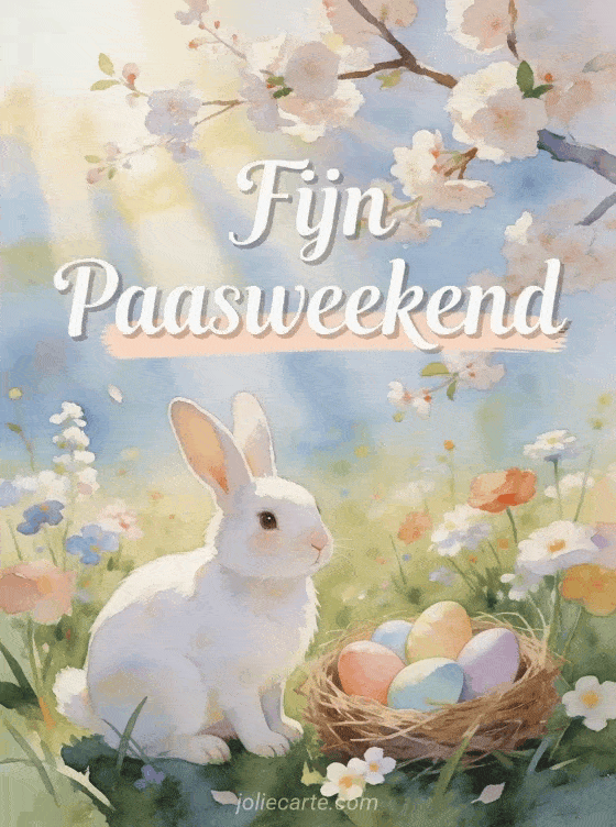 Stuur een mooie kaart voor het paas weekend met een wit konijn in een bloeiend lentemeidoornveld. Ontdek ook een paasweekend of een paas wknd.