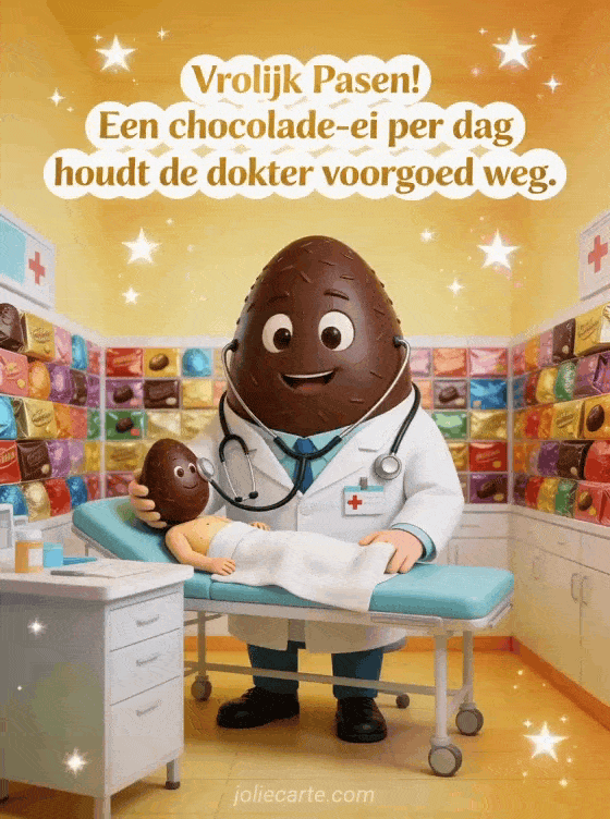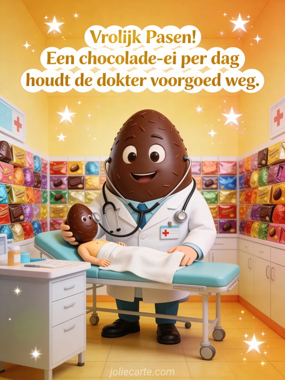 Stuur een humoristische paasei-kaart met een chocolade-ei als dokter die een klein chocolade-ei als patiënt behandelt. Ontdek ook een fijn paasweekend humor of een grappige afbeelding pasen.